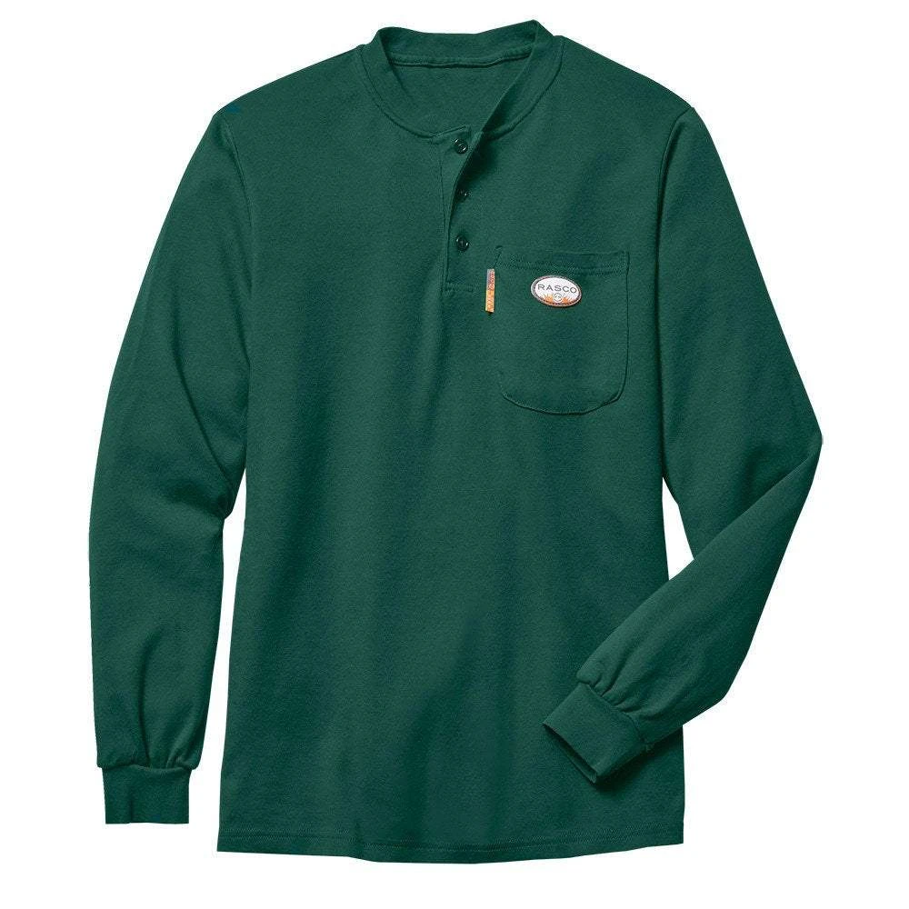 Be comfortable while you work in this long sleeve work tshirt. Made of flame resistant fabric in green, with a single breast pocket, and three buttons.